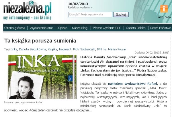 Historia Danuty Siedzikówny „Inki” siedemnastoletniej sanitariuszki AK skazanej na śmierć i rozstrzelanej przez komunistycznych oprawców opisana została w książce „Inka. Zachowałam się jak trzeba...” Piotra Szubarczyka. Patronat nad publikacją objął portal Niezalezna.pl.